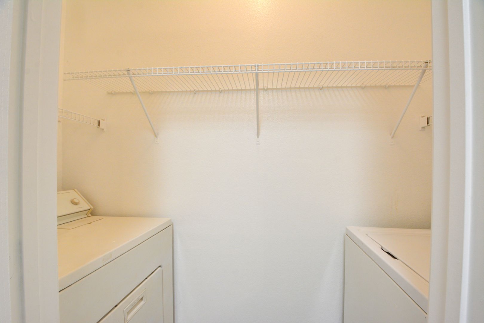 Laundry closet with washer & dryer with a storage cabinet.